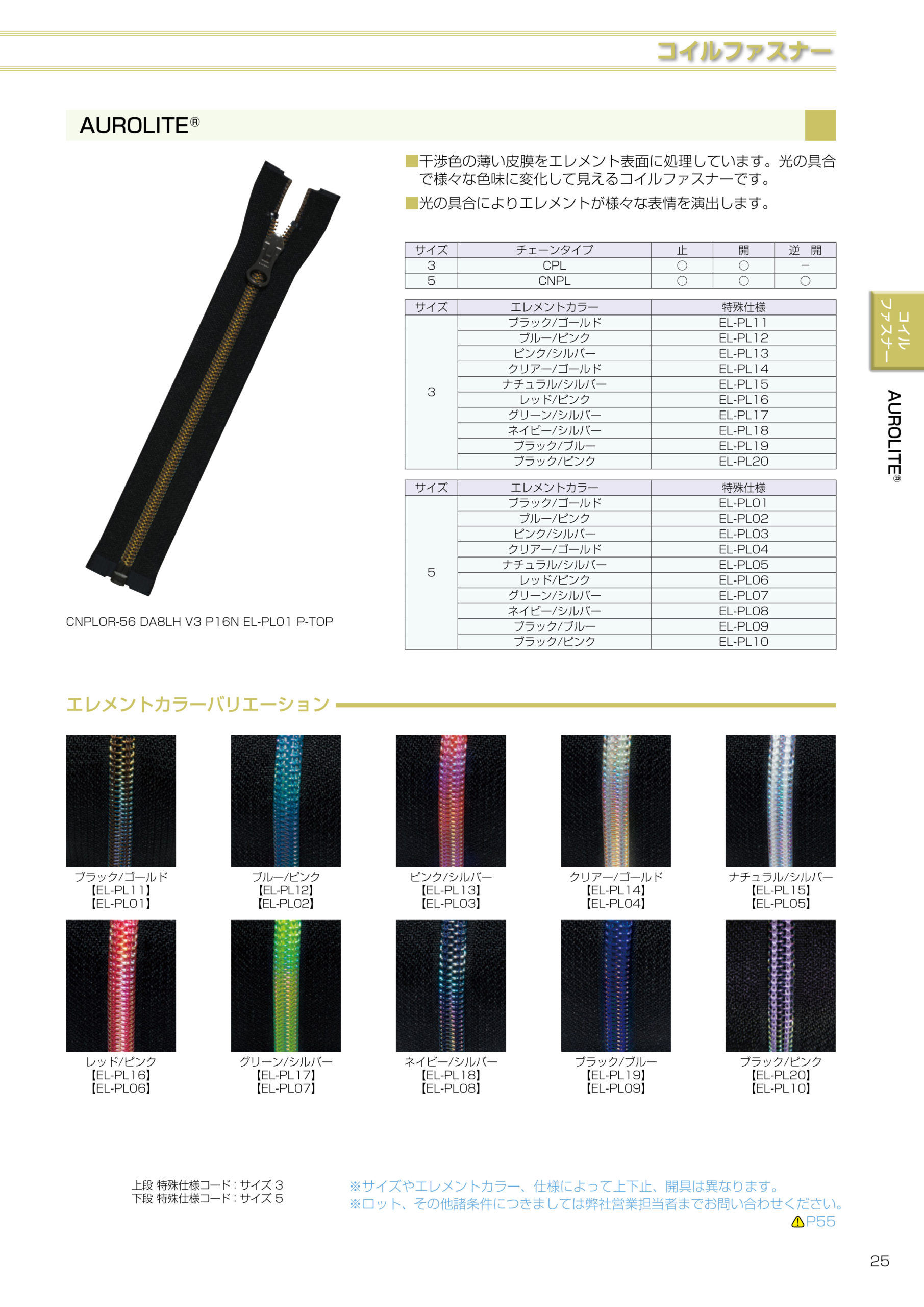 干渉色の薄い皮膜を何重にもエレメントに処理することにより、光の具合でシャボン玉やプリズムのような様々な色味に変化して見えるファスナーです。メタリオンとは、また違った輝きのファスナーです。スポーツウェアやスポーツバッグ、ラントセル等でよく使用されています。エレメントカラーバリエーションはこちらからご確認ください。