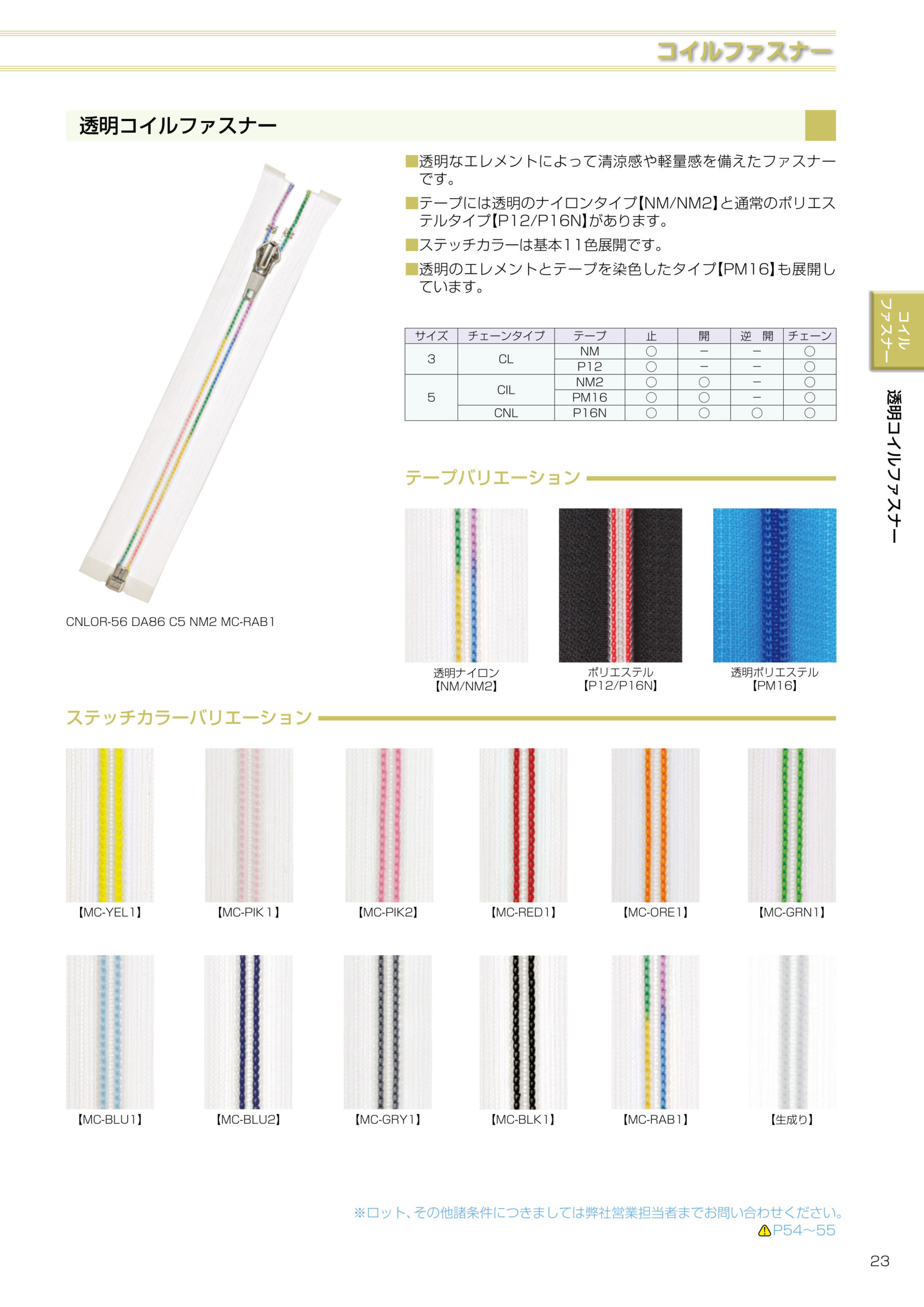 エレメントが透明なコイルファスナーです。清涼感や軽量感を備えます。テープ部分は2種類あり、通常の全色選べるポリエステルテープと透明なナイロンテープがあります。透明コイルとテープを縫い付ける糸の色を11色から選べます。服以外にもペンケースやプールバッグなどの透明の袋物にもとても合います。