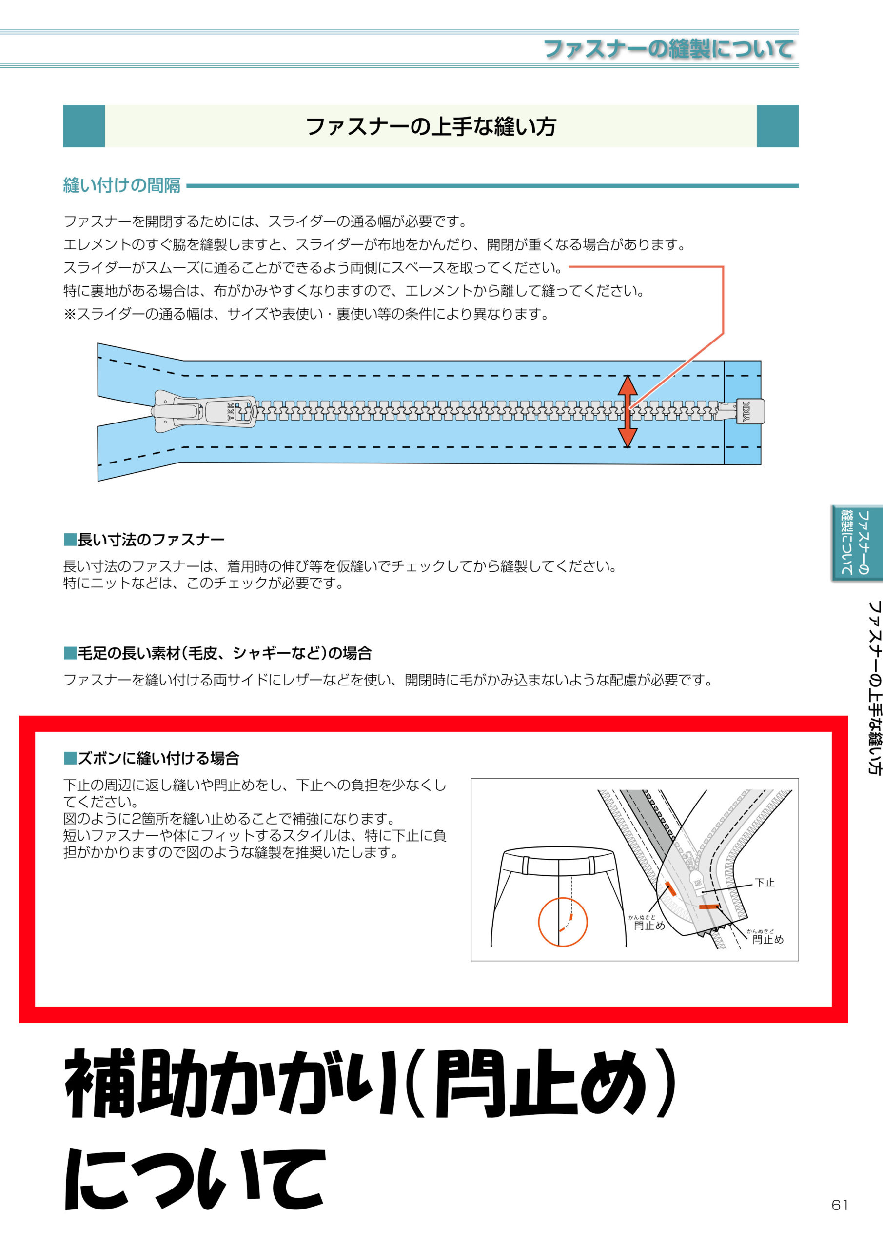 - 特に短いファスナーや体にフィットするスタイル・パンツ類への使用の場合、着脱の際に直接下止にかかる負担を少なくするため、”補助かがり(閂止め)”を付けてください。
